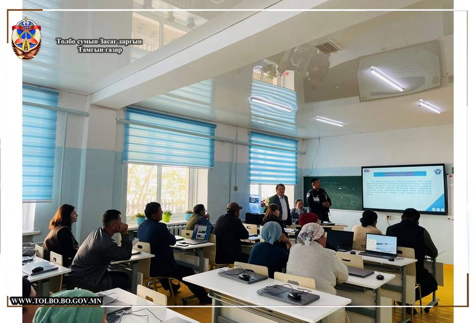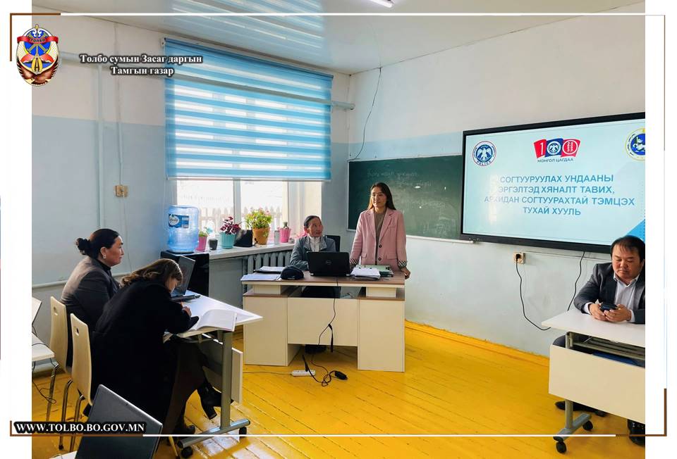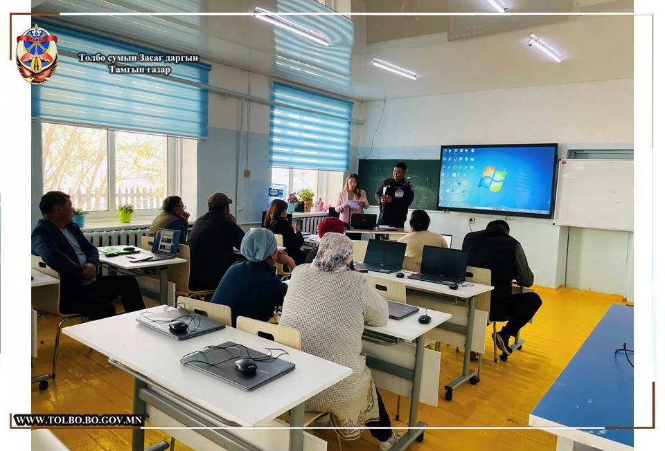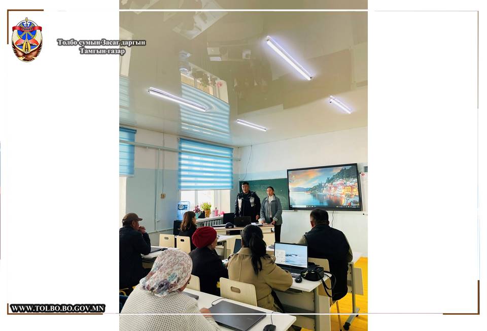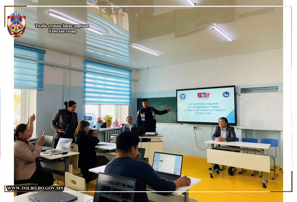 Толбо сумын Ерөнхий боловсролын сургуулийн албан хаагчдад Гэмт хэргээс урьдчилан сэргийлэх салбар зөвлөлөөс Гэмт хэргээс урьдчилан сэргийлэх тухай хууль, Архи согтууруулах ундааны эргэлтэд хяналт тавих, Архидан согтуурахтай тэмцэх тухай хууль, Цахим залилан, Эрүүгийн тухай хууль, Зөрчлийн тухай хуулийн талаар сургалт зохион явууллаа.
