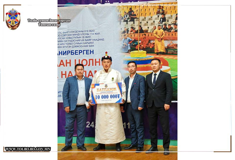 Тулгар төрийн 2234 жил, Их Монгол Улс байгуулагдсаны 819 жил, Үндэсний эрх чөлөө, тусгаар тогтнолоо сэргээн мандуулсны 114 жил, Ардын хувьсгалын 104 жил, Баян-Өлгий аймаг үүсэн байгуулагдсаны 85 жилийн ойн үндэсний баяр наадмын хүчит 128 бөхийн барилдаанд уран мэхийг уралдуулан, зургаа даван үзүүрлэж “Аймгийн заан” цол хүртсэн Баян-Өлгий аймгийн Толбо сумын харьяат, “Алдар” спорт хороо, “Бес Богда бүргэдүүд” клубийн бөх Хуанышын Танирбергений мялаалга наадам өнөөдөр эхэллээ. Тус мялаалга наадамд зориулсан хүчит 64 бөхийн барилдаан аймгийн Спортын цогцолборт өргөн дэлгэр зохион байгуулагдаж байна. Зохион байгуулагч: Толбо сумын Иргэдийн Төлөөлөгчдийн Хурал, Засаг даргын Тамгын газар.